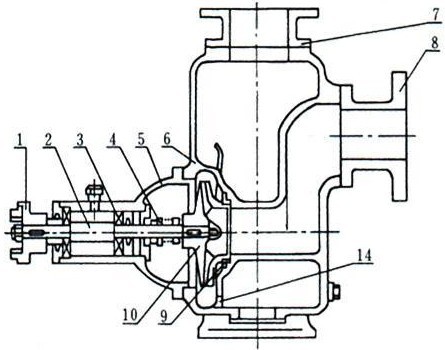在一些泵的軸承體底部還設(shè)有冷卻室。當(dāng)軸承發(fā)熱引起軸承體溫升超過(guò)70度時(shí),可在冷卻室處通過(guò)任意一只冷卻液管接頭,注人冷卻液循環(huán)冷卻。泵內(nèi)部防止液體由高壓區(qū)向低壓區(qū)泄漏的密封機(jī)構(gòu)是前后密封環(huán),前密封環(huán)裝在泵體上,后密封環(huán)裝在軸承體上,當(dāng)泵經(jīng)長(zhǎng)期運(yùn)轉(zhuǎn)密封環(huán)磨損到一定程度,并影響到水泵的效率及自吸性能,應(yīng)給予更換.